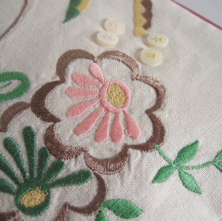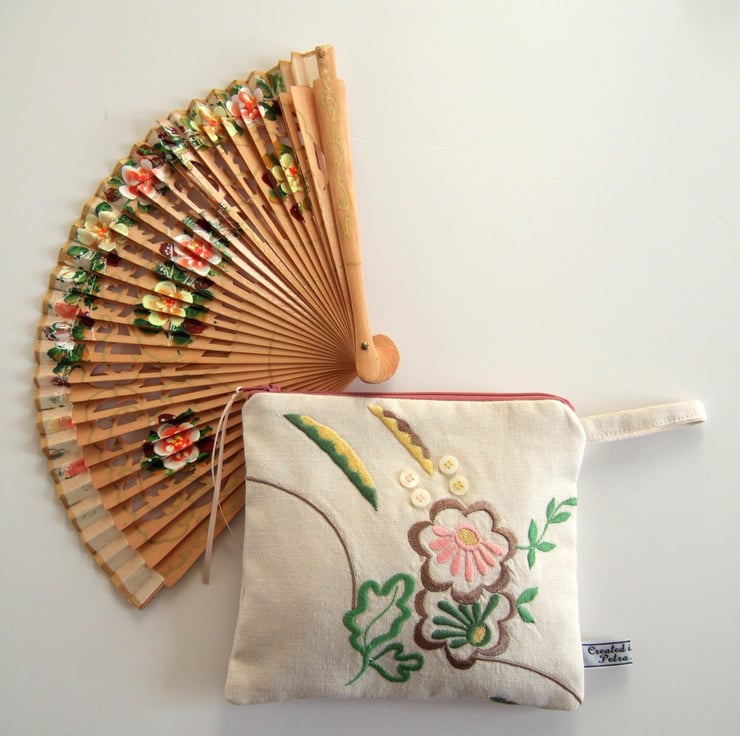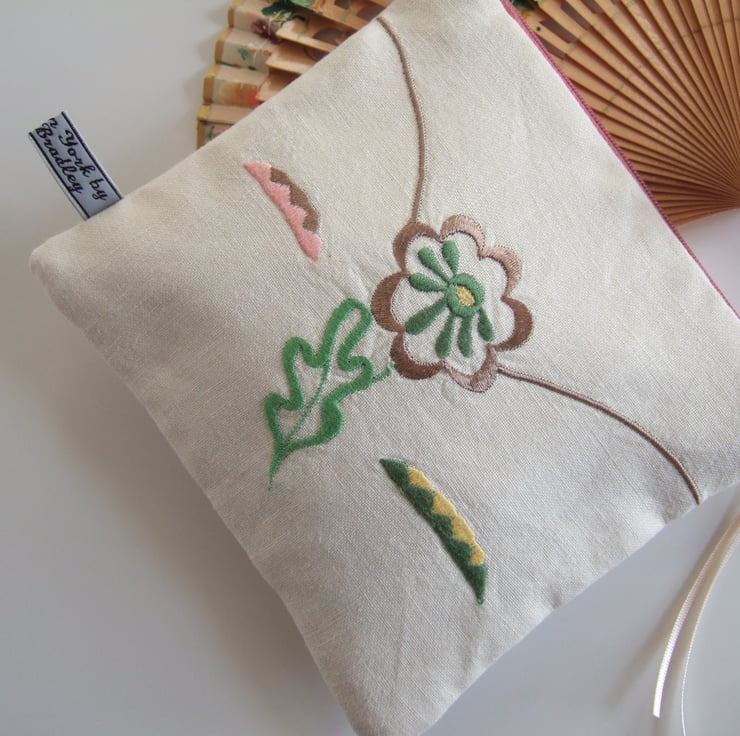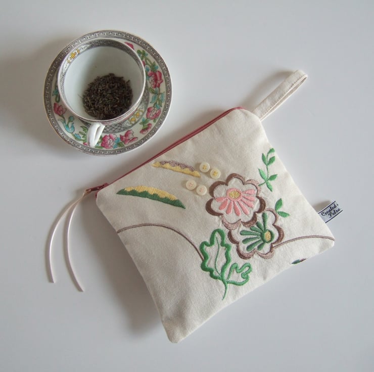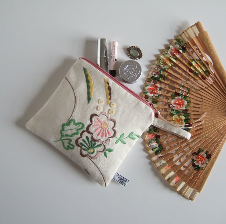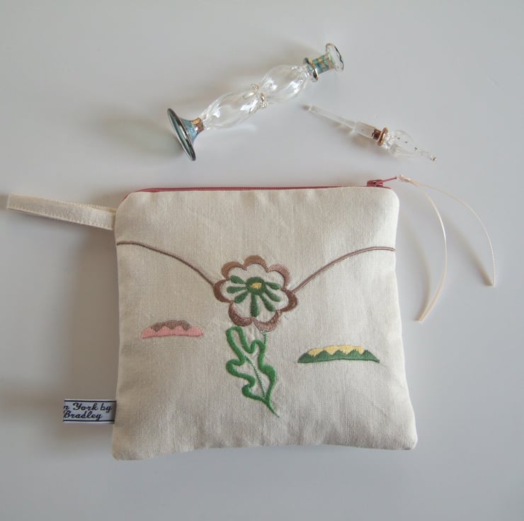 A pretty makeup bag or purse, with machine stitched embroidery, in sweet pastel colours. The stylised flowers have an Art Deco feel, whilst its softly faded appearance gives away its history. It was once the corner of a grand, but now retired, vintage tablecloth. It would make a lovely present for a vintage fabric fan, or an Art Deco lover.