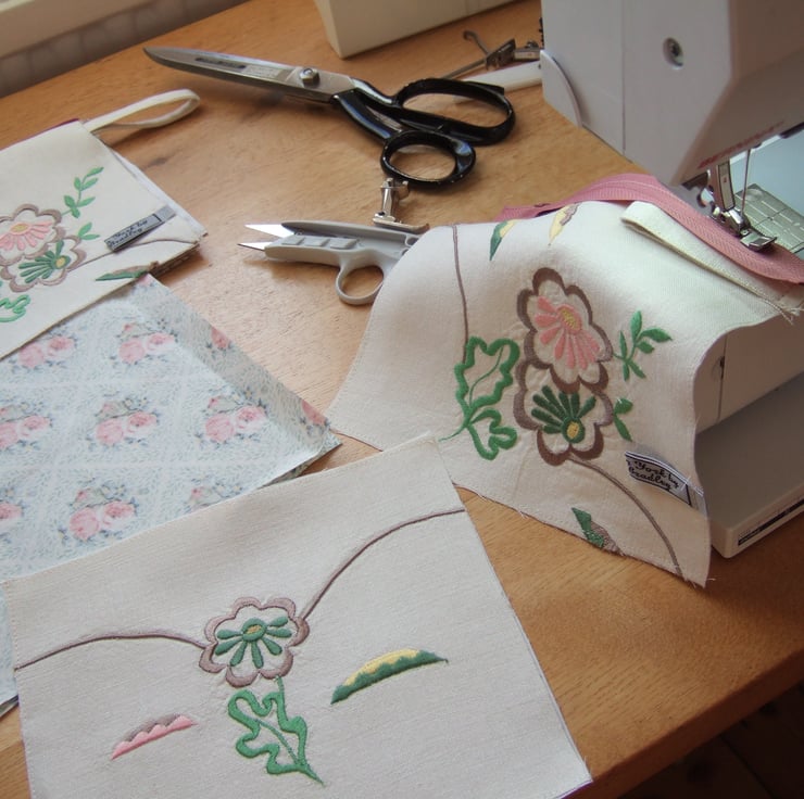 I spied this wonderful old linen tablecloth at York car boot. Altho its life covering the table in a country house was over, I was able to still find some sections to make a set of pretty makeup bags.