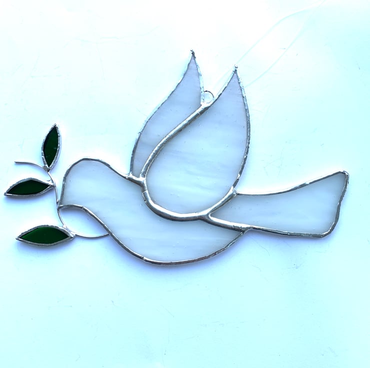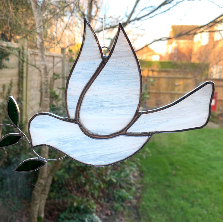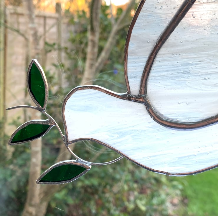 This peace dove has been made from streaky white and clear stained glass with green stained glass for the leaves.
