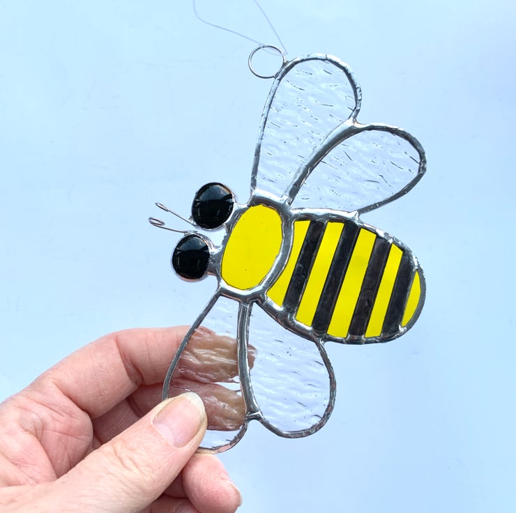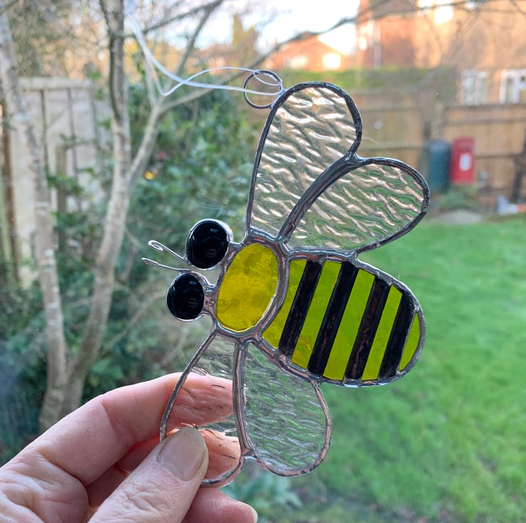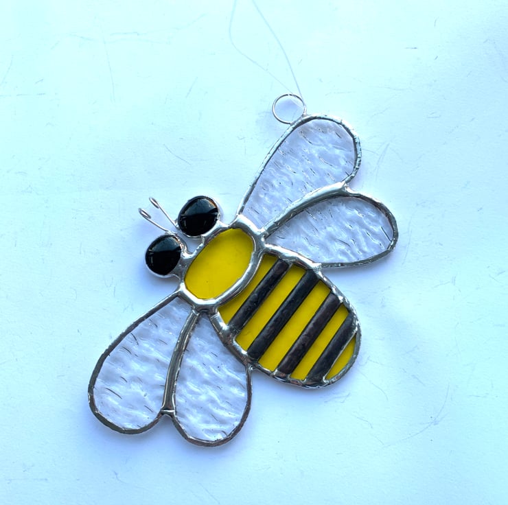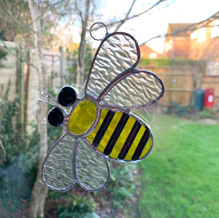 This suncatcher has made by cutting the glass by hand, grinding each piece to remove any sharp edges, foiling with copper foil, soldering and then washing. A patina has been applied to the stripes to blacken them. The glass used for this bee is a textured yellow glass for the body and clear textured glass for the wings.