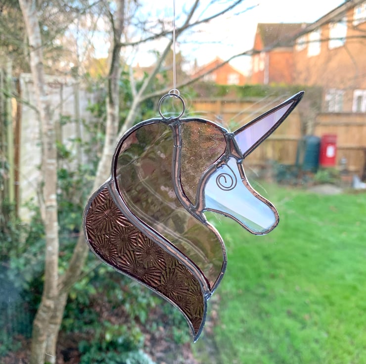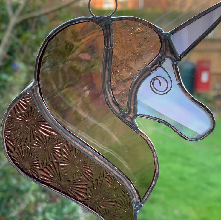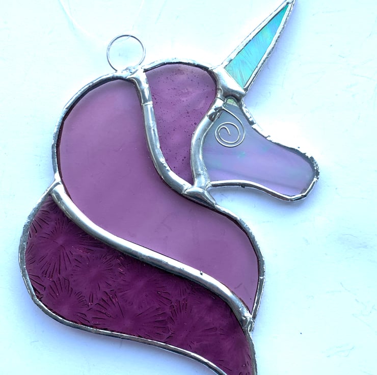 This unicorn has been made from 3 types of pink stained glass and irredised white streaky glass.