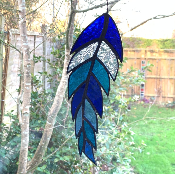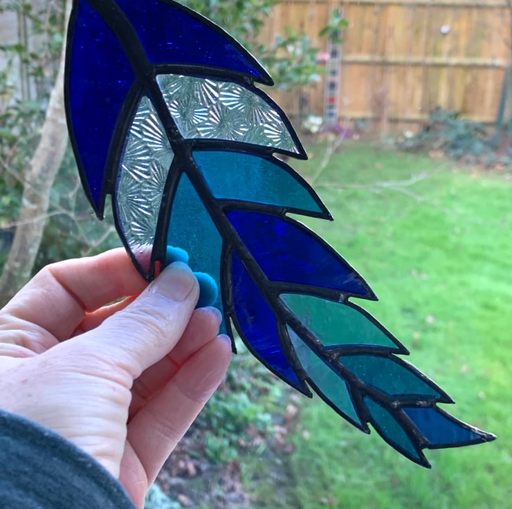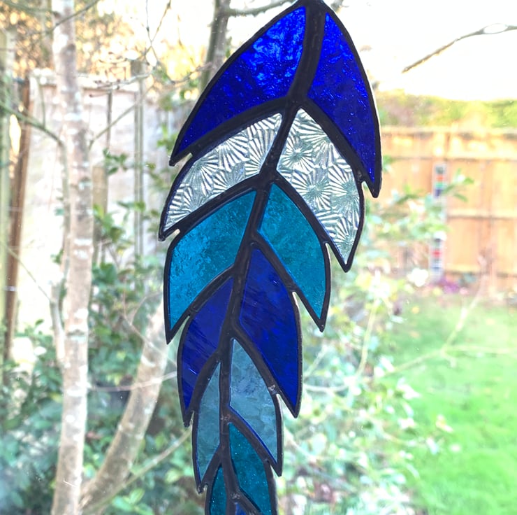 This feather has been made from 7 types of blue and turquoise coloured stained glass.