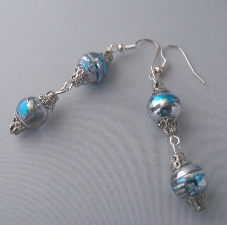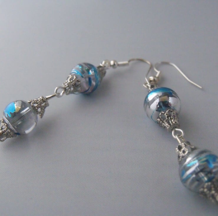 This is a pair of blue and silver beaded earrings, set with silver filigree caps and finished with a fishhook. They are just under 2 inches long excluding the fitting. These beads really sparkle when catching the light.