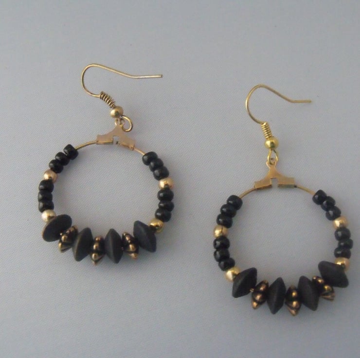 Here we have a pair of hooped earrings, threaded with black and gold discs and seed beads in black and gold. They are approx. 1.5 inches long excluding the fishhooks