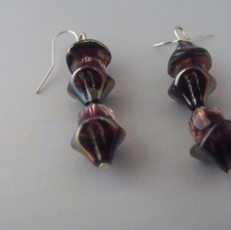 These earrings are mainly purple but show other colours when the light catches them. The beads are unusual shapes. The length is approx. 1.75 inches excluding the fishhook