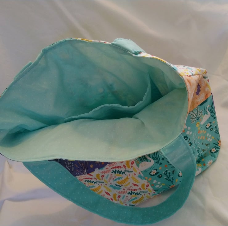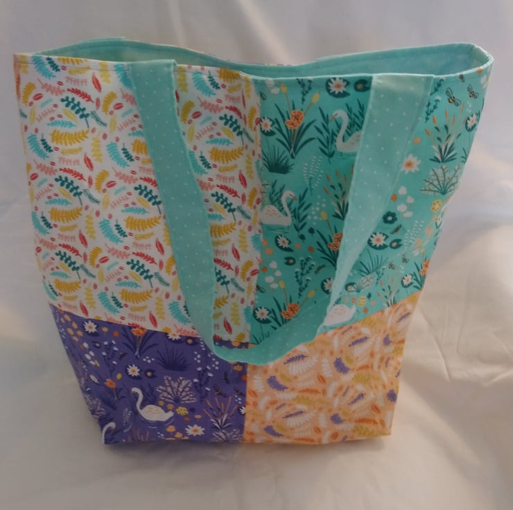 This tote bag has been made from fabrics featuring swans on a purple and blue lake as well as coordinating fabrics featuring feathers and leaves in a patchwork design, a perfect gift for bird lovers!