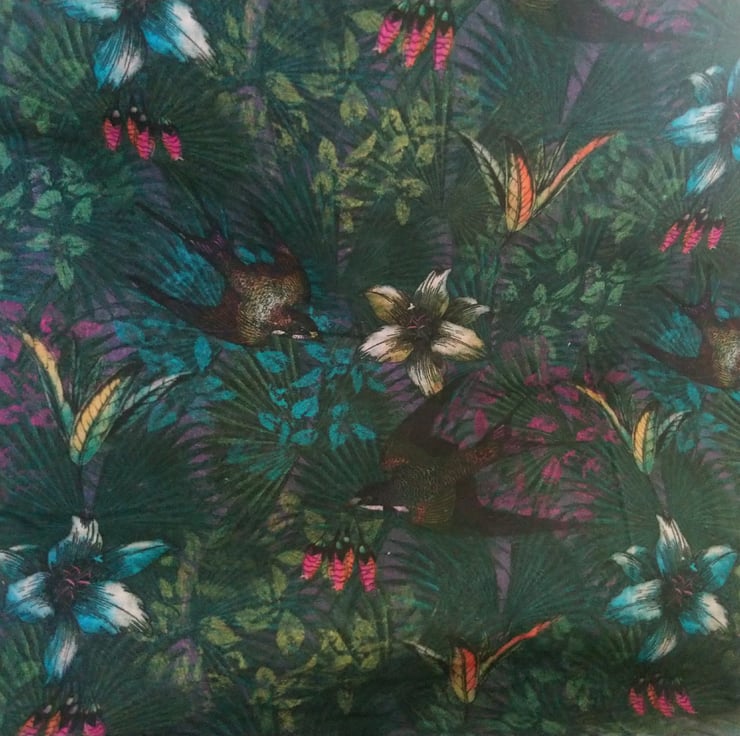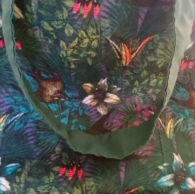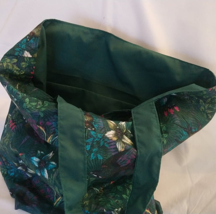 This tote bag has been made from a green fabric featuring flowers and flying birds.