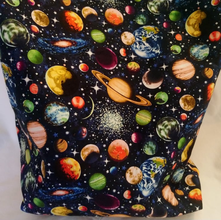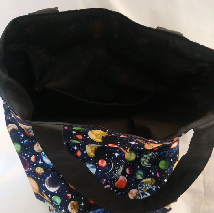 This tote bag has been made from a black fabric featuring a variety of different planets in the solar system, as well as stars and moons