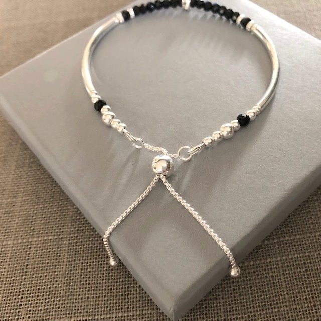 Handmade sparkly dainty noodle bracelet made with 3 - 4mm faceted black Spinel semi precious gemstones with a Cubic Zirconia encrusted rondelle bead to the centre with a mixture of Sterling Silver round and long tube beads. I finished the bracelet with a Sterling Silver slider clasp, the clasp is fully adjustable and should fit most wrist sizes.