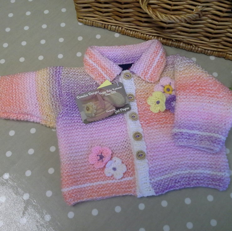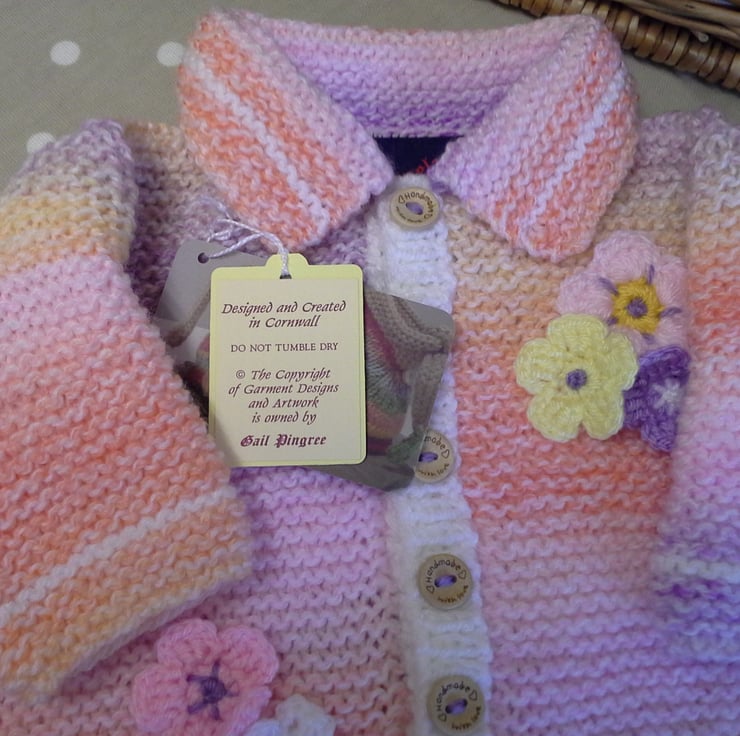 A beautiful baby girl's practical warm jacket/cardigan designed and lovingly hand crafted using quality branded British machine washable yarns. The flowers are all hand crocheted with hand french embroidery knots in the centres. The buttons are made from genuine wood with a sweet centiment burnt etched on them.