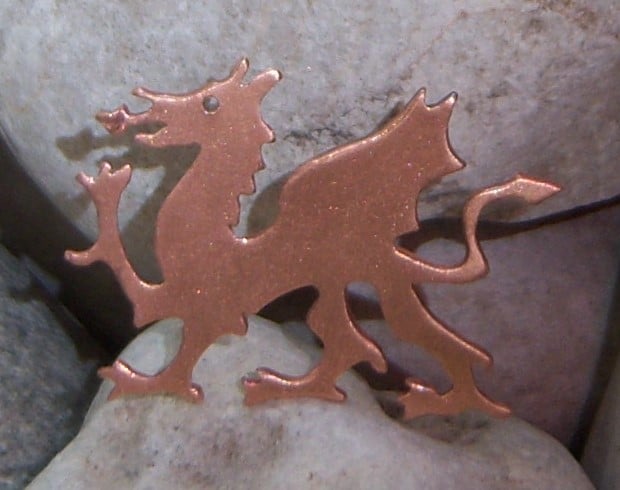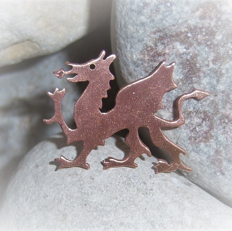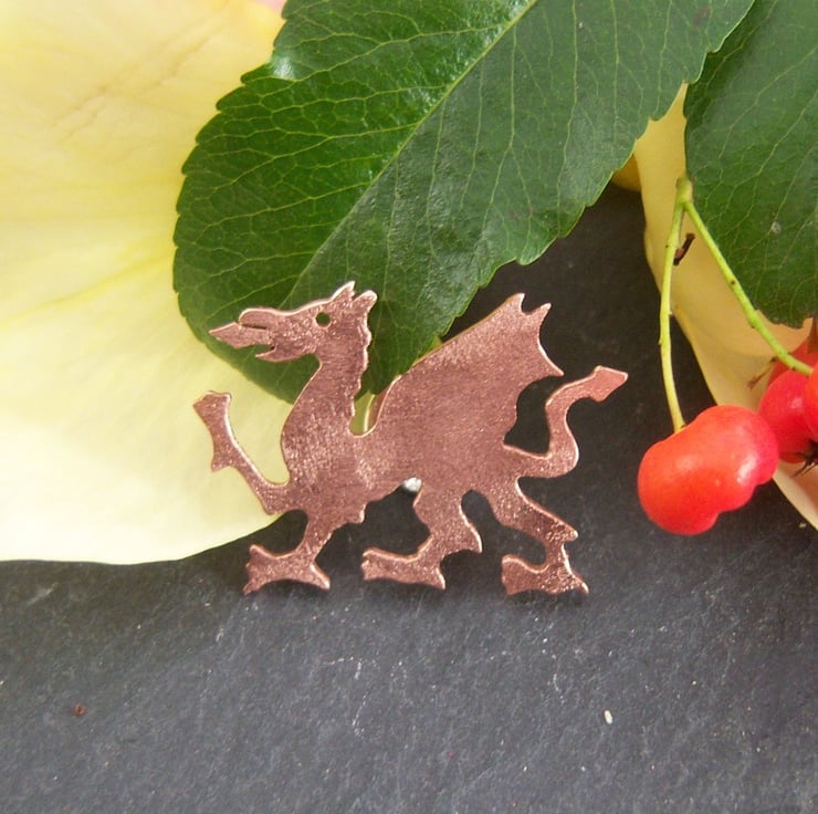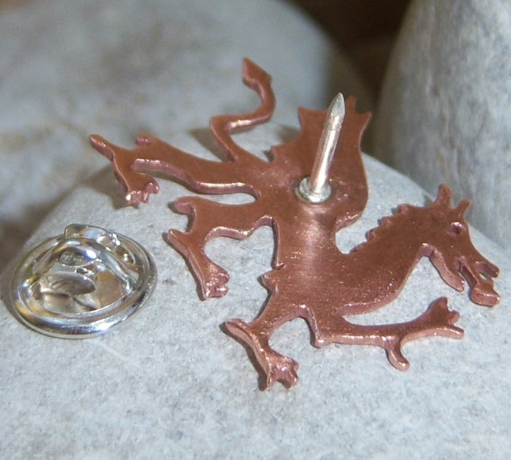 A little dragon, cut from copper sheet. Approximately 2cms tall and 3cms across. Frosted effect added. The fastener is a sterling silver pin soldered to the back of the dragon, with matching clutch grip /tie tack / tie pin / clutch pin - not sure what they're called but long enough to go through a lapel if required. (see 2nd photo)