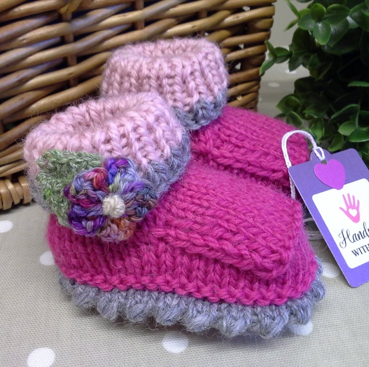 A beautiful luxury pair of baby girl's booties designed and lovingly hand crafted using genuine branded Jeager British spun Marino wool yarns. The flowers are hand crouched using a quality hand dyed yarn purchased from a Folksy member.