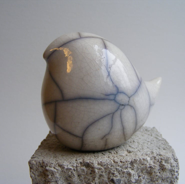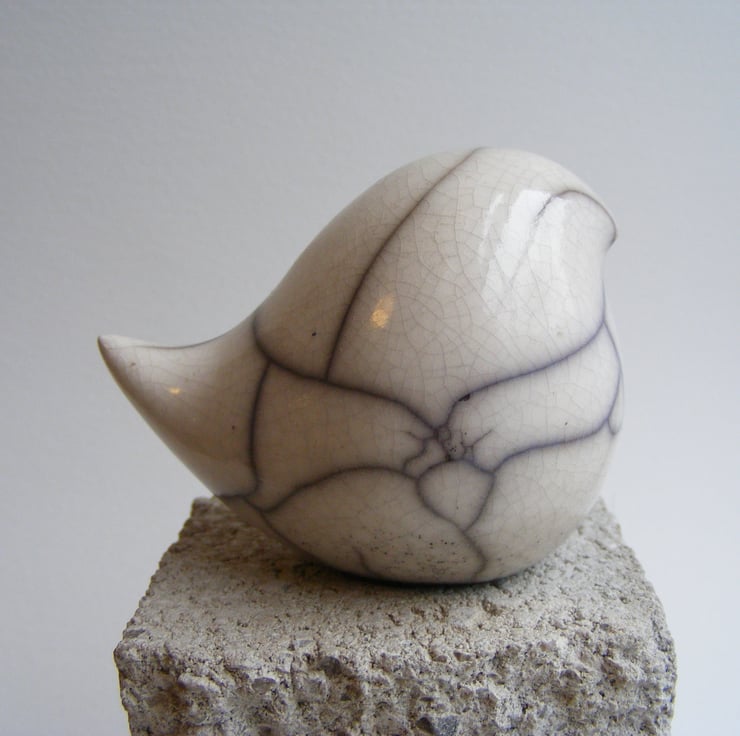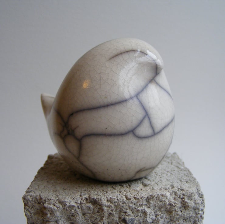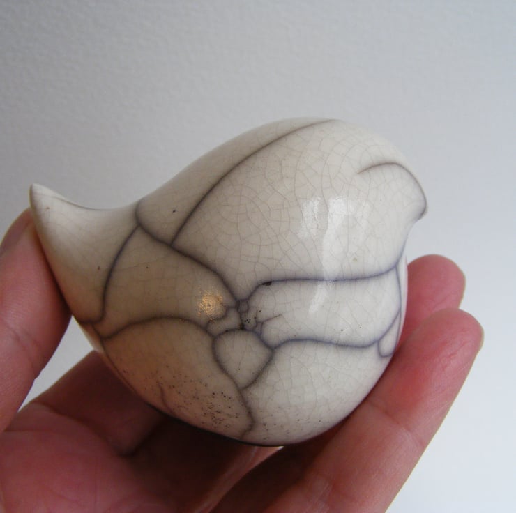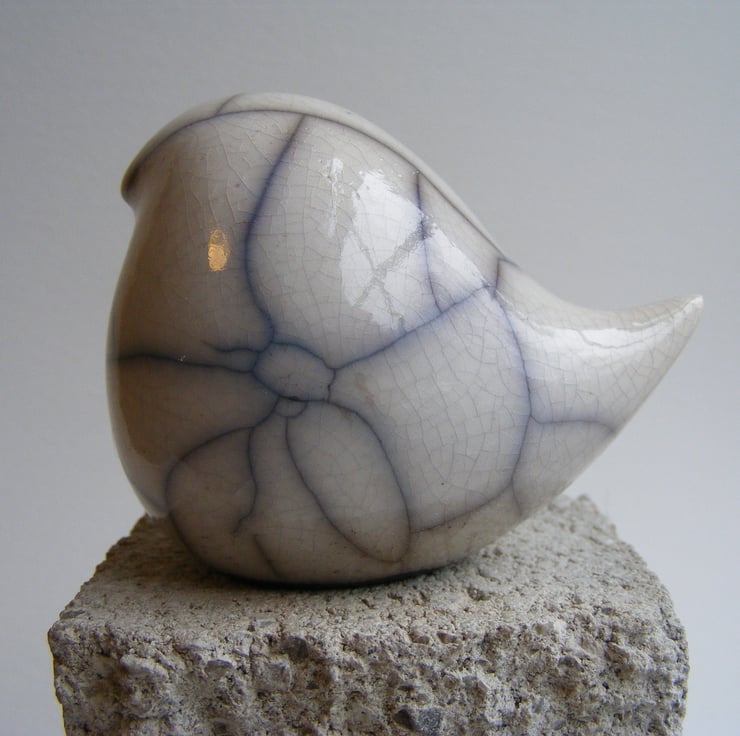 This bird is hand made and measures, 5cm high and 6.8cm long. It is made from white earthenware clay and fired first in an electric kiln then four layers of clear glaze is painted on and it is then raku fired in a gas kiln and then smoked in a bucket of sawdust which highlights the crazing.