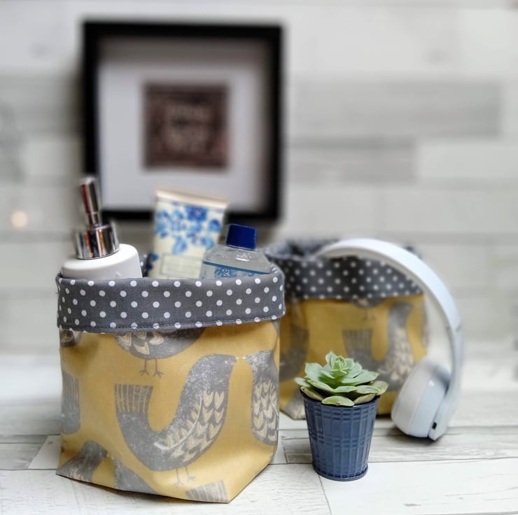 This listing is for two, stylish storage baskets carefully hand-made using matt PVC coated cotton in a mustard scandi birds design and lined with a complementary spotted grey cotton lining. (the lining differs slightly from that shown in main photo - please see photos 2 and 3 for reference)