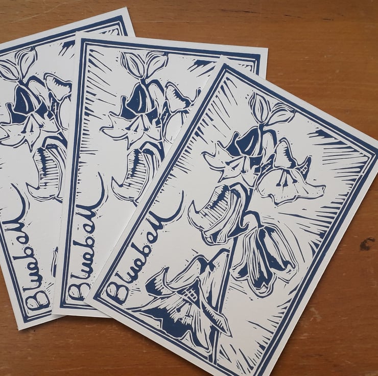 Prints from an early bluebell lino tile have been trimmed to create these postcards, so creating budget and postal-friendly pieces of original artwork!