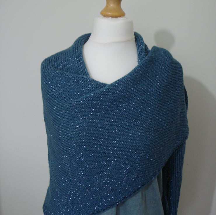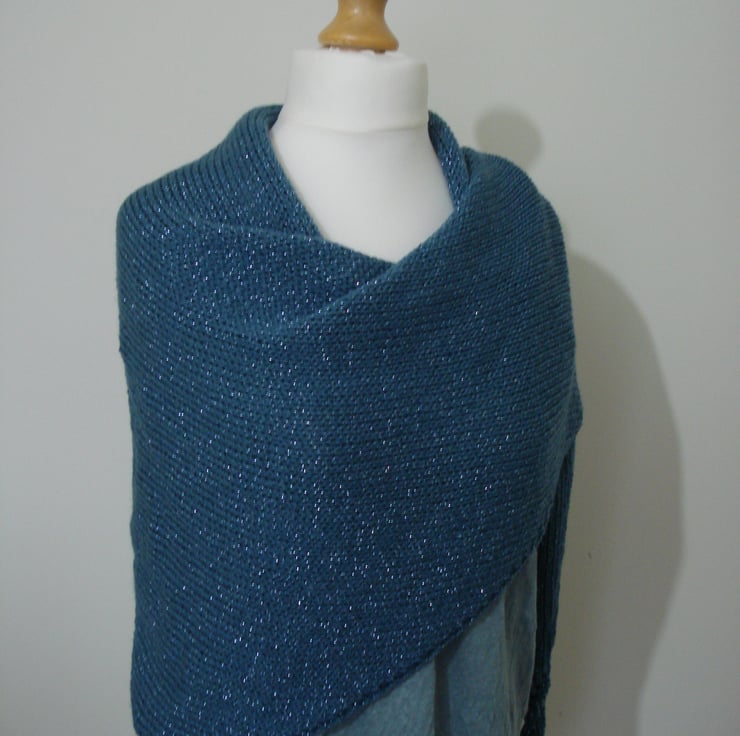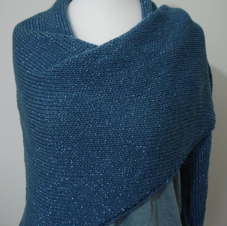 This triangular knitted wrap will make a much loved addition to your wardrobe, or a wonderful gift. It has been lovingly handmade on a domestic knitting machine and features silver flecks and pretty eyelets along two side.