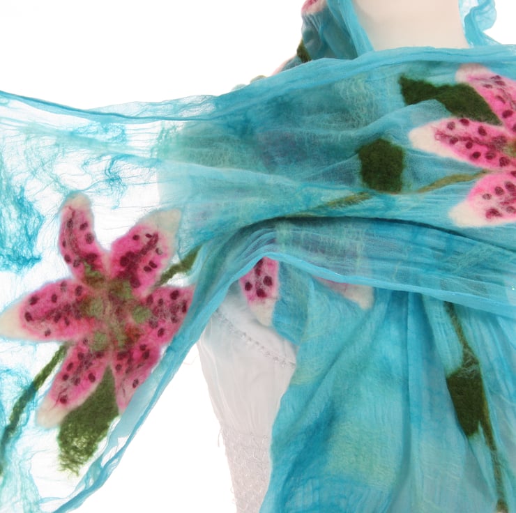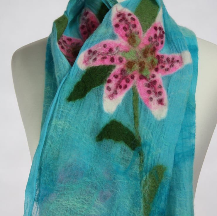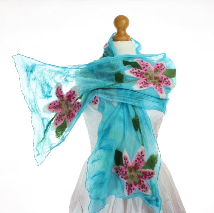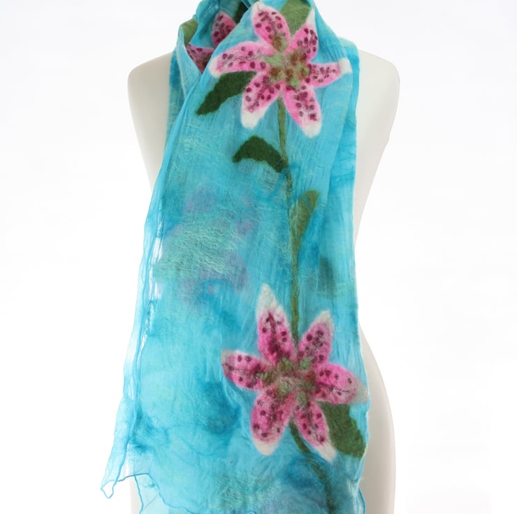 Hand dyed turquoise silk scarf with a trailing pink stargazer lily pattern felted on using the nuno felting technique. Pale blue and green wool has been felted onto the background of the scarf to give a wispy effect. Beautiful statement piece in lovely bright eye-catching colours.