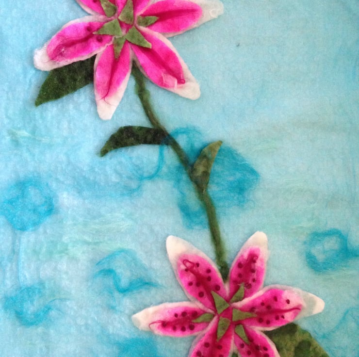 I love the size and colours of stargazer lily blooms and wanted to recreate them on a scarf. As with all my felt scarves this piece has been designed to be worn but it would equally look good as a wall hanging.