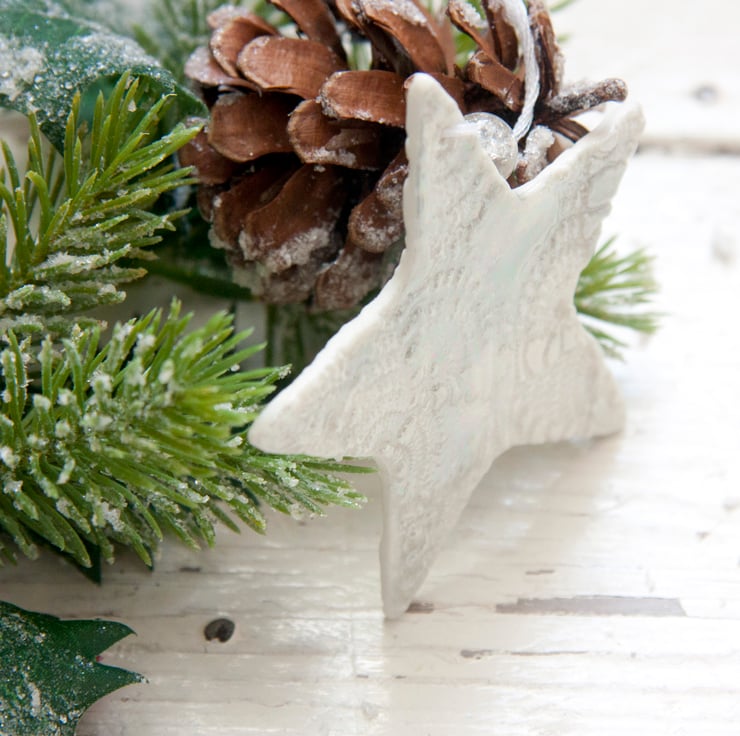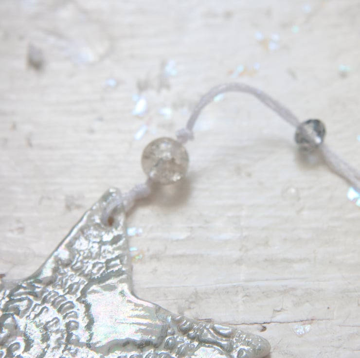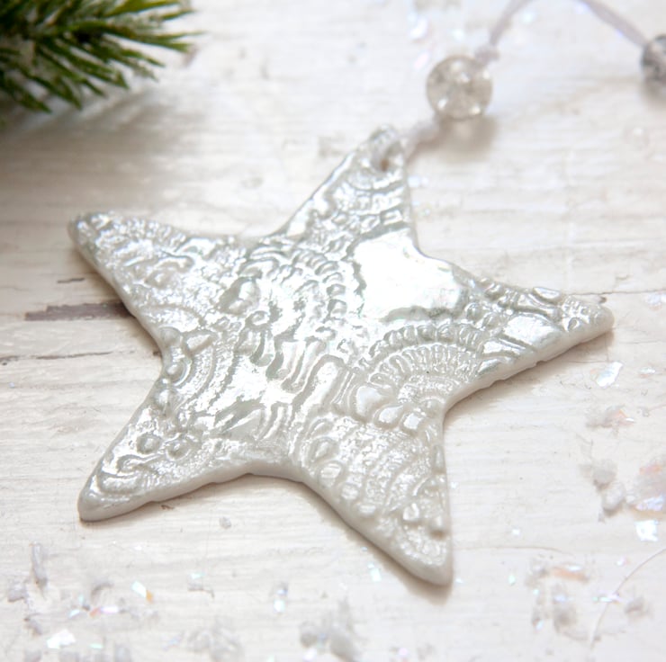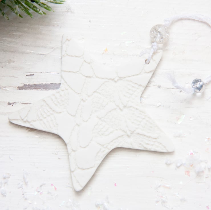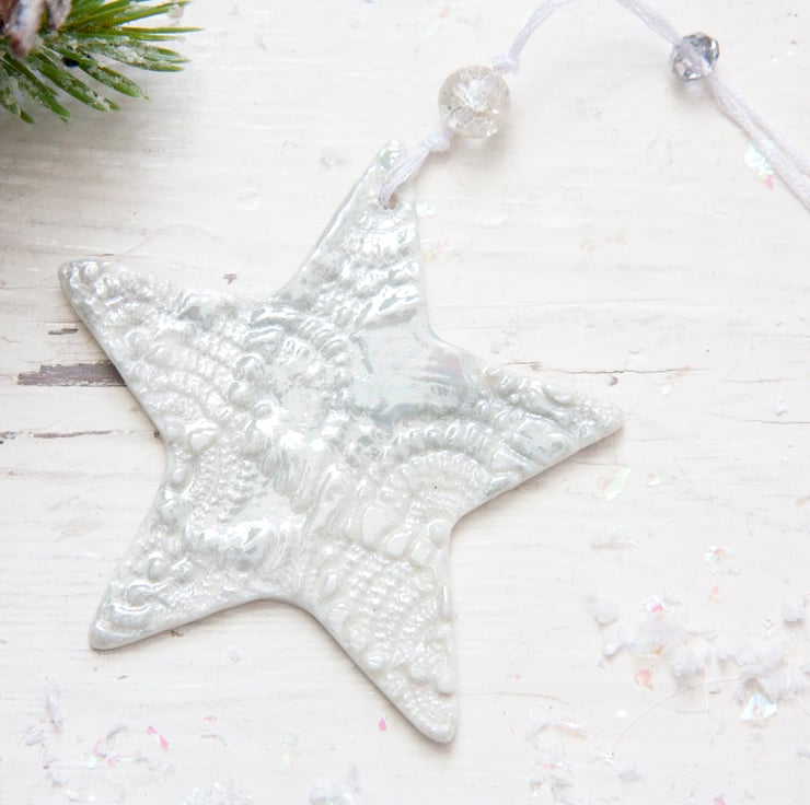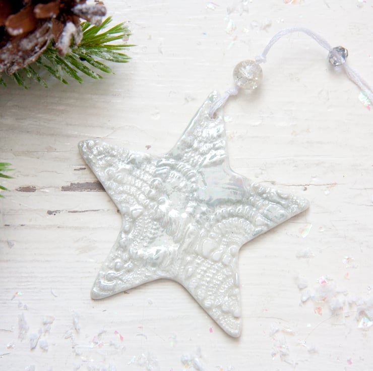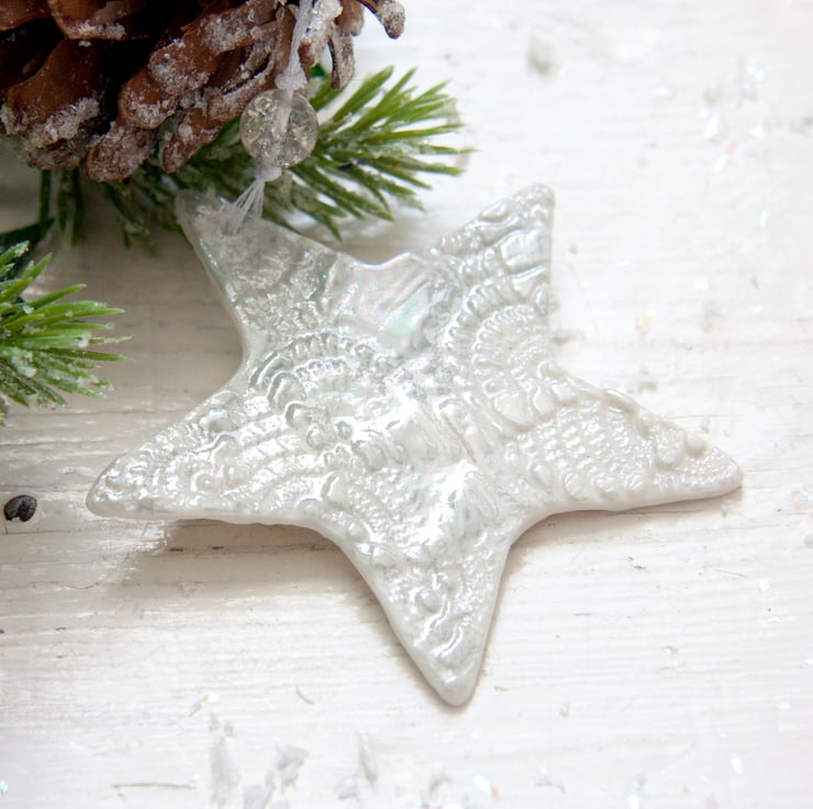 This is a fine porcelain snowflake that has been imprinted on both sides with lace, before going through its first firing. It is then glazed, and has its second firing. Finally, each decoration is hand painted with mother of pearl lustre to give a high shine finish and goes through a third and final firing.