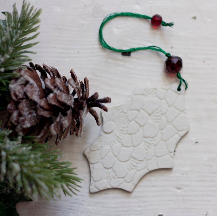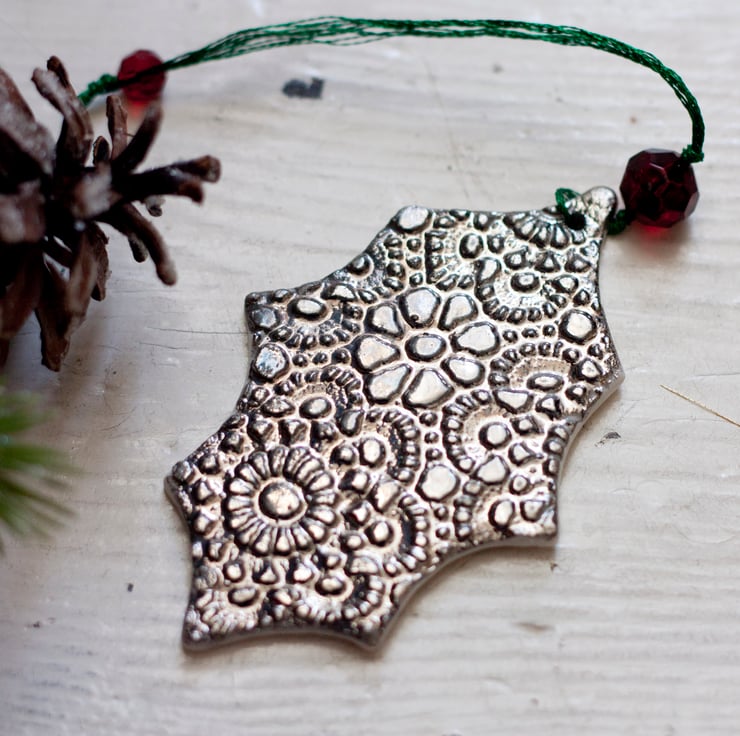 This is a fine porcelain holly leaf that has been imprinted on both sides with lace, before going through its first firing. It is then glazed, and has its second firing. Finally, each decoration is hand painted with platinum lustre to give a metallic finish and goes through a third and final firing.