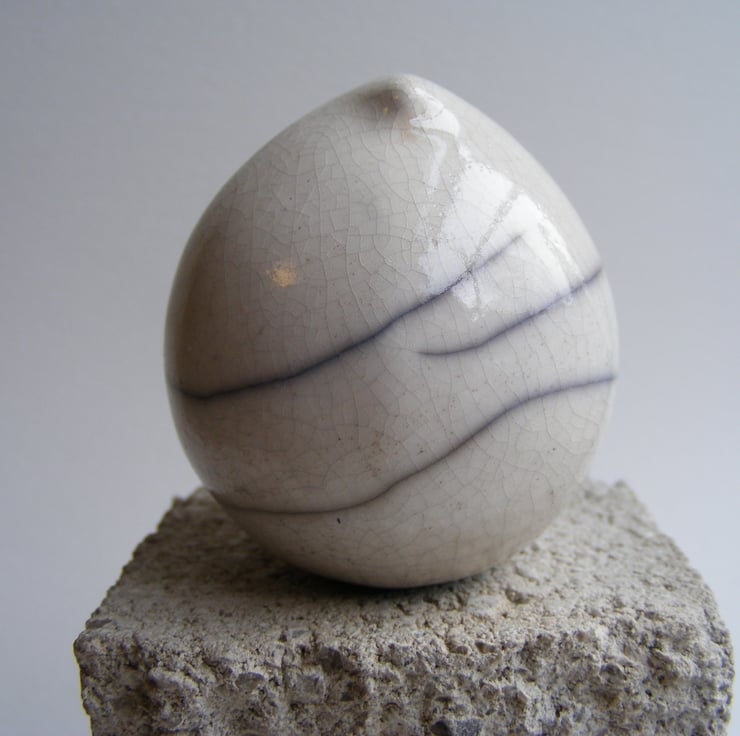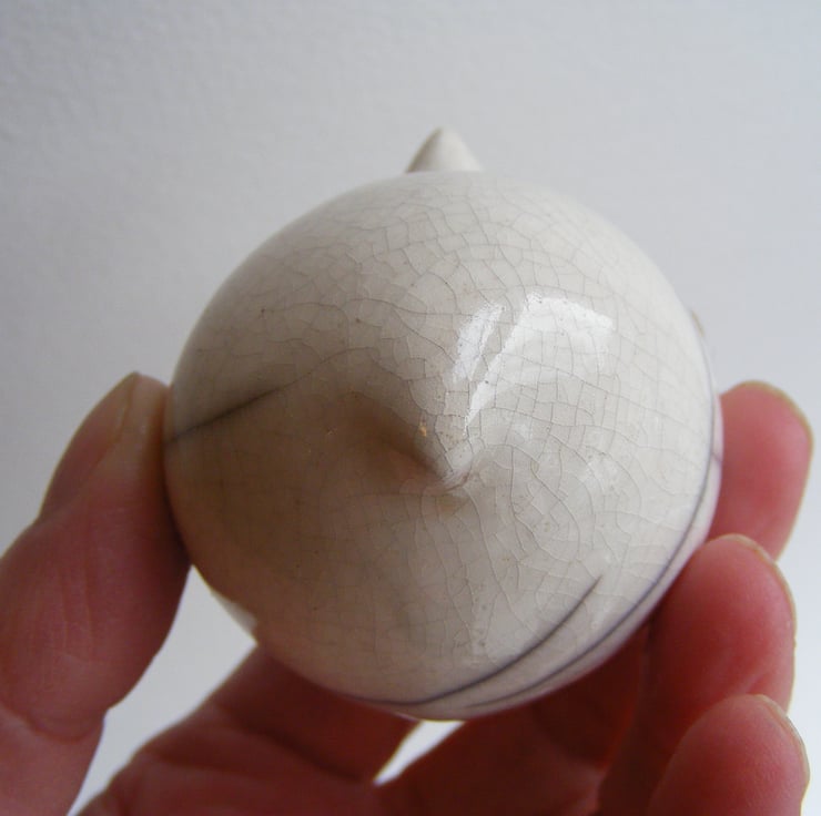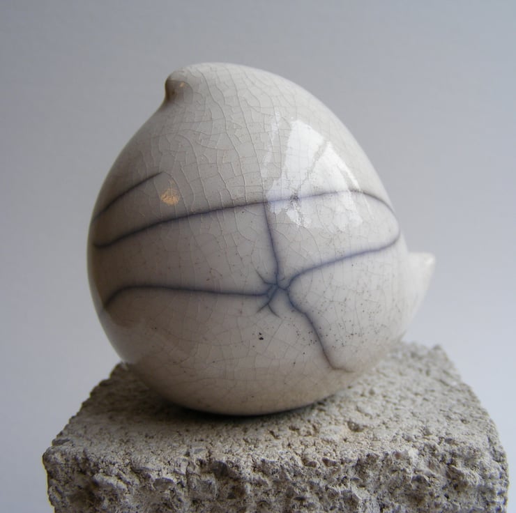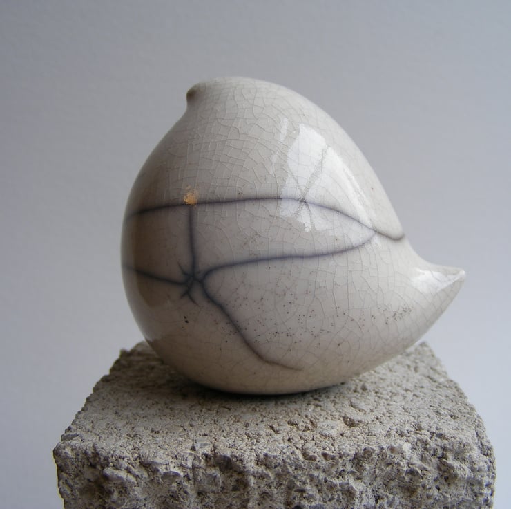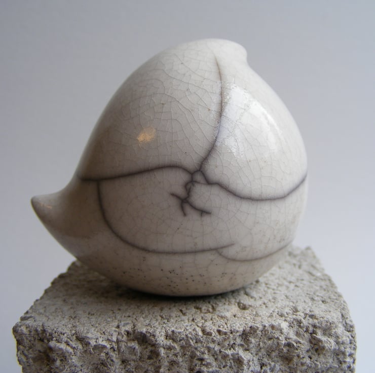 This bird is hand made and measures, 5cm high and 5.5cm long. It is made fom white earthenware clay and fired first in an electric kiln then several layers of clear glaze is painted on and then it is raku fired in a gas kiln.