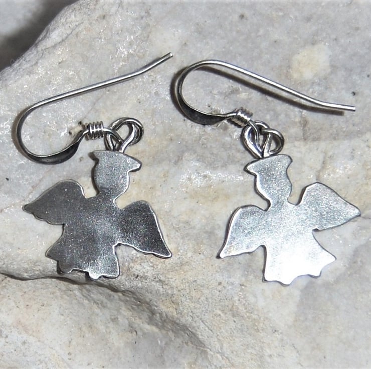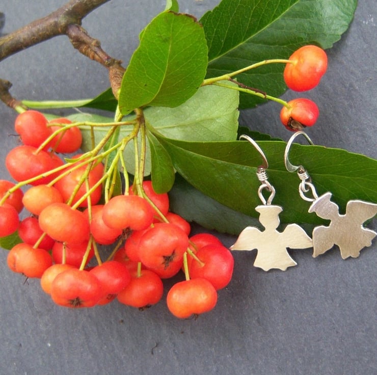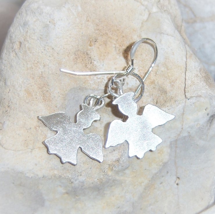 Angels (or fairies?) hand cut from sterling silver sheet. Just under 1.5cms tall and just over 1.5cms from wingtip to wingtip. Sterling silver ear wires.