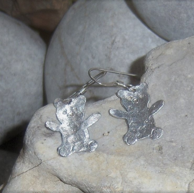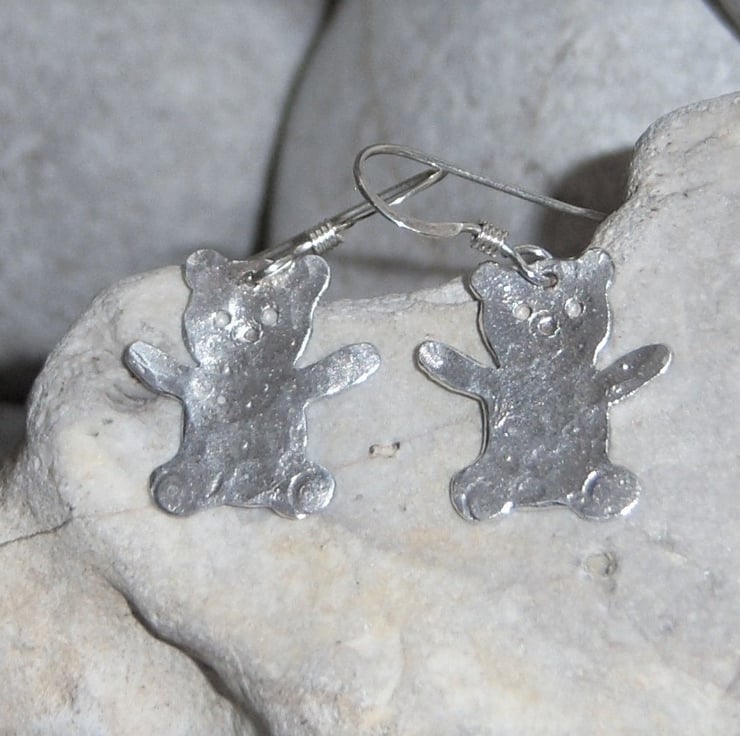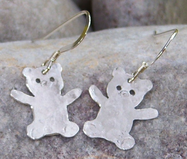 Teddy bears earrings hand cut from sterling silver sheet and textured. Approximately 1.5 cms tall. Sterling silver ear wires.
