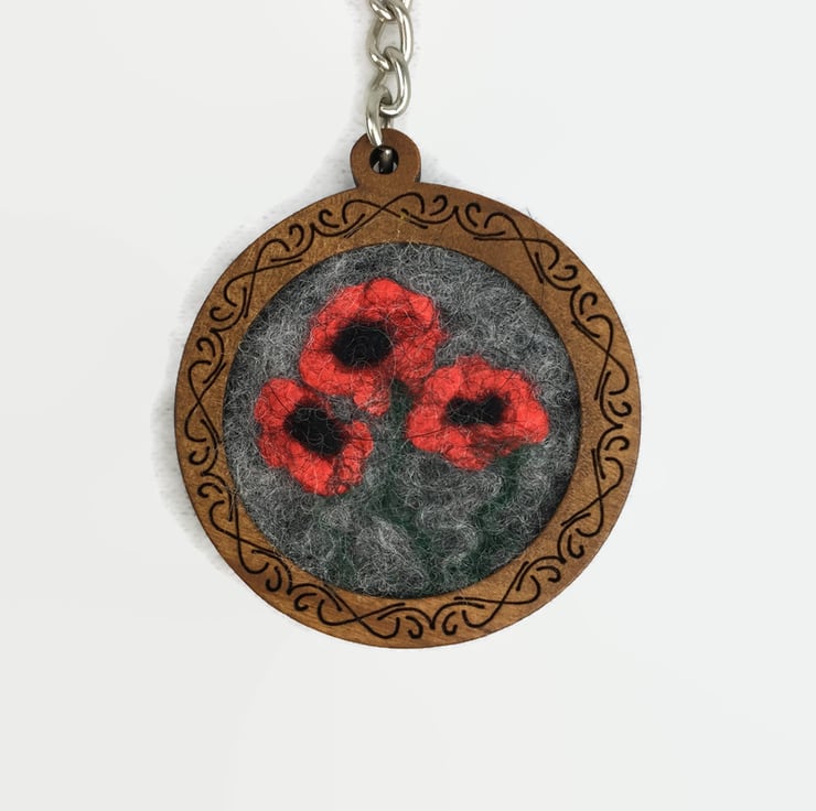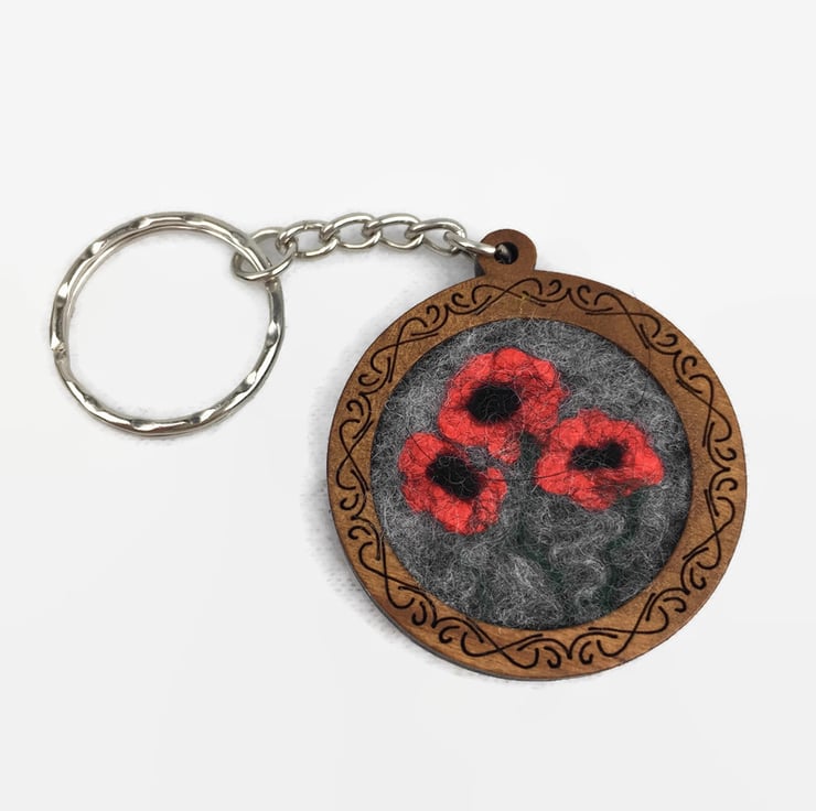 A wooden key fob with a decorative border with a pretty felted poppy picture insert. The poppy picture has been wet felted using grey merino wool fibres for the background and bright red silk fibres for the poppies. The picture is mounted onto a wooden key fob with a decorative border and a keyring is attached by means of a short length of curb chain.