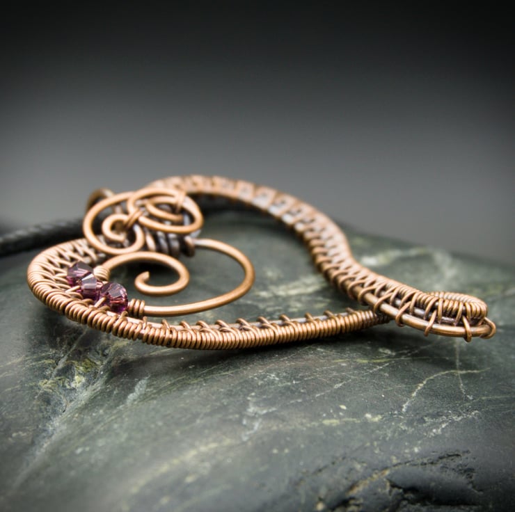 This gorgeous heart pendant has been hand woven from copper wire. Three thicker lengths of wire have been laced together using very fine wire with a flame weave to create an intricate pattern around the curves of the heart shape. I've then finished it by spiralling the ends of the wires & adding 3mm Swarovski® crystal bicone beads. These crystals are Amethyst coloured - the colour for February, so it would make a lovely present for a February birthday!