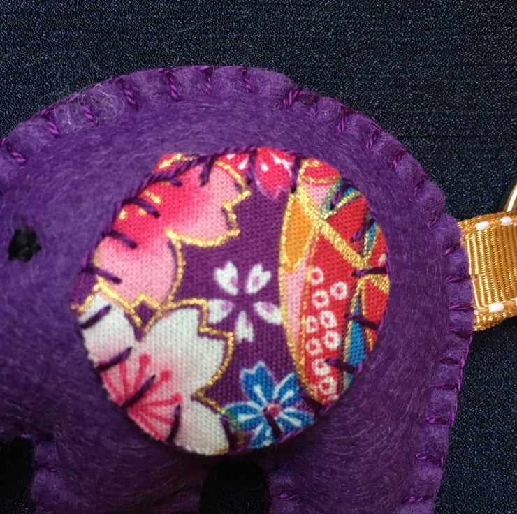 It is handmade from wool blended felt, blanket stitched and the ears feature beautiful gilded Japanese fabric. The eyes have been embroidered on.