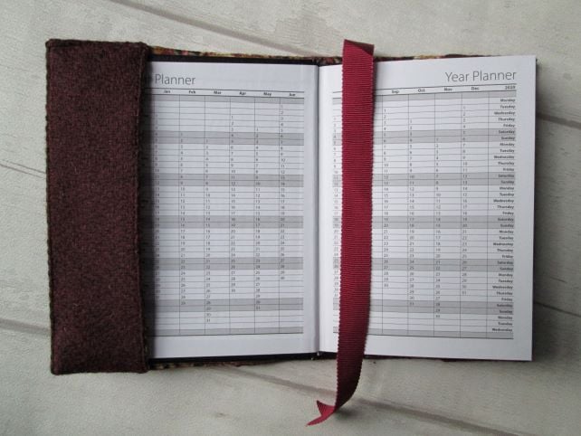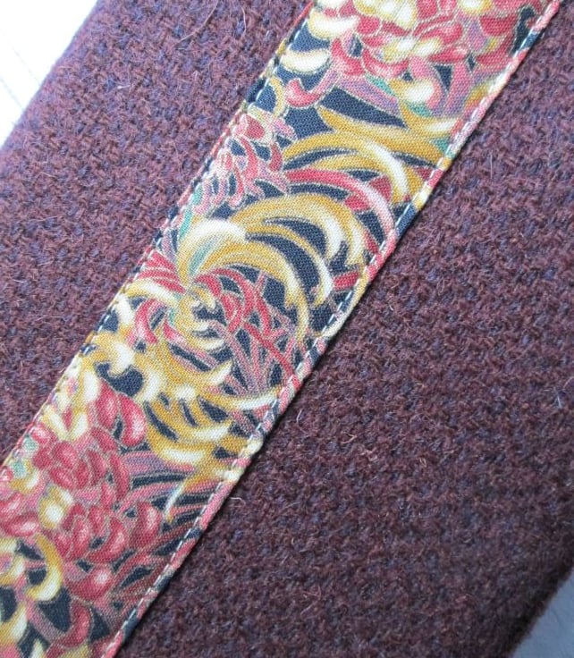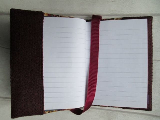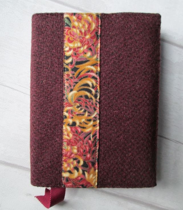 I've teamed a piece of rich,chestnut brown 'Harris Tweed' handwoven on the Isle of Lewis with a rich oriental print of chrysanthemums to create this reusable notebook/diary cover complete with a handy ribbon place marker. Small enough to slip into a bag or pocket and complete with either an A6 lined notebook or, for and additional £1, an A6 week-to-view diary it would make a lovely gift.