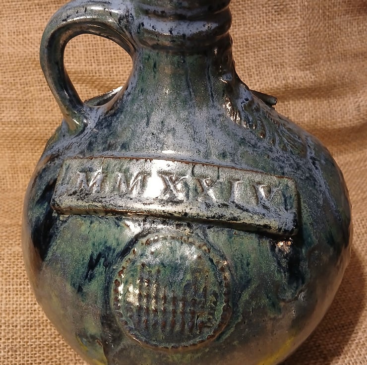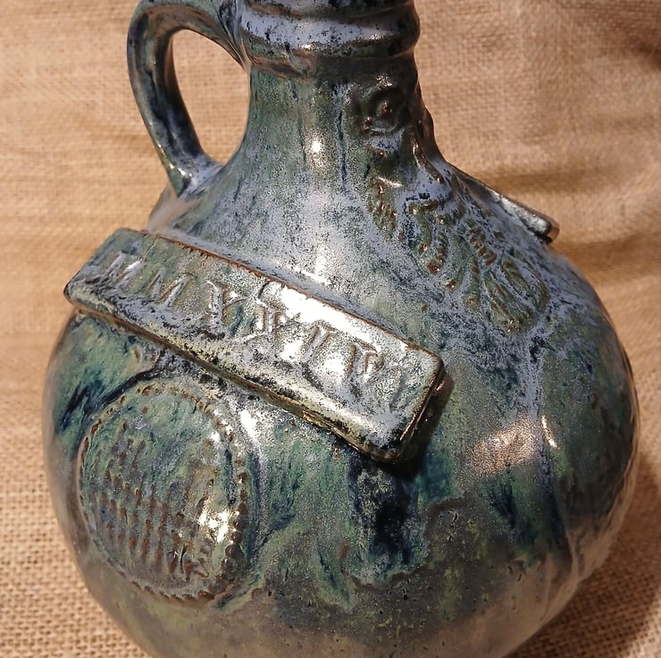My Bellarmines are slip cast using a plaster mould then have sprigs added. Sprigs are stamped or decorated pieces of clay which are added to the raw clay shape. The Roman numerals are the date the pot was made- 2024, and is therefore a very limited edition! ( I think I've made no more than 10 this year).