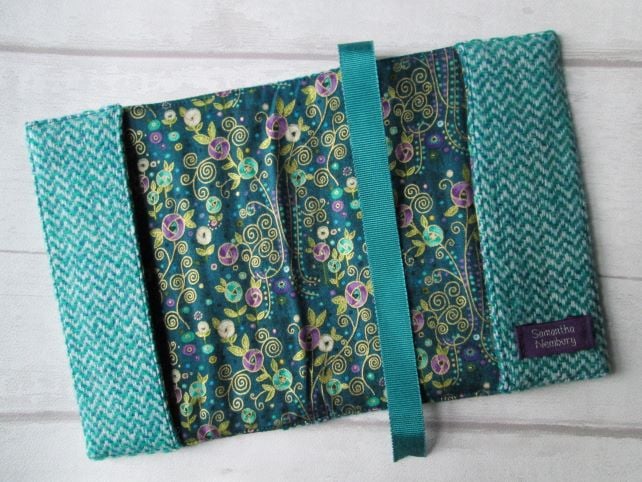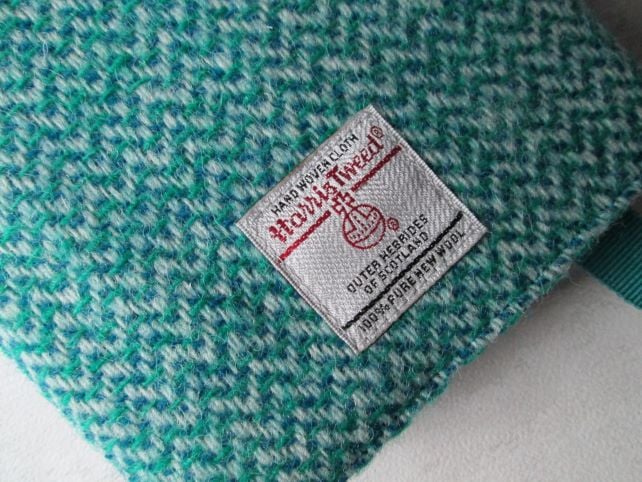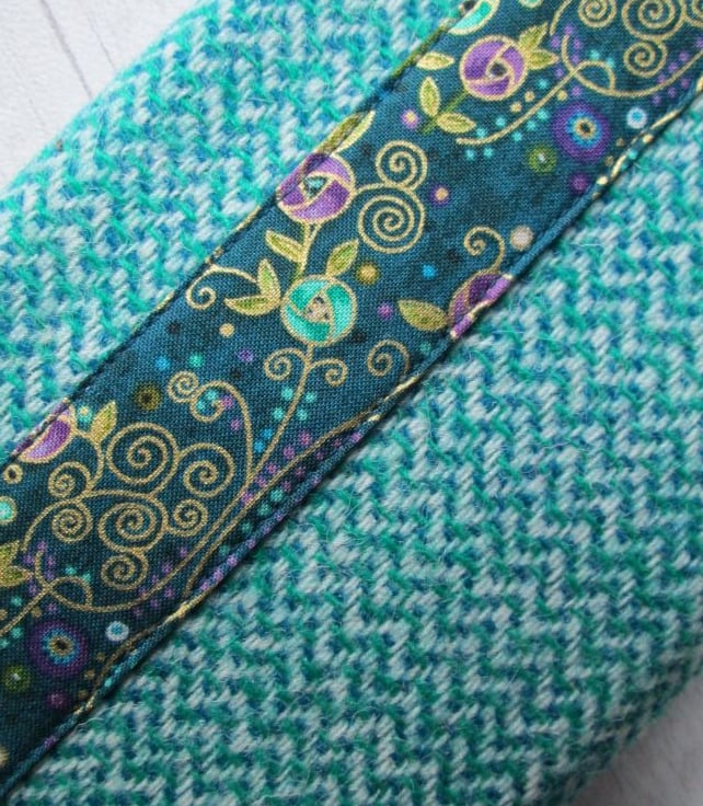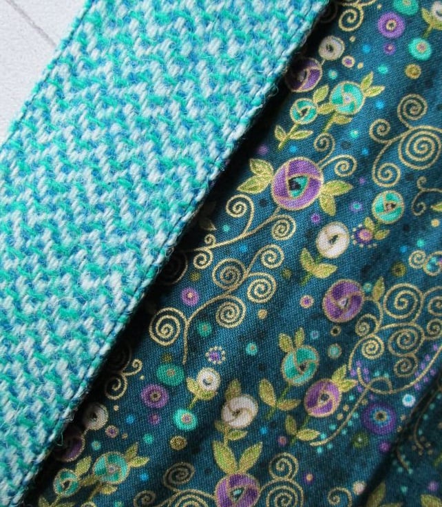 These two pieces of fabric arrived on the same day and, as soon as I saw the blue-green flowers on the print, I realised that not only did they match the tweed, but the Mackintosh style design would be a perfect 'Scottish' complement to the 'Harris Tweed'. I found I also had a length of Petersham ribbon in just the right shade of turquoise, so, all in all, it's turned out rather beautifully.