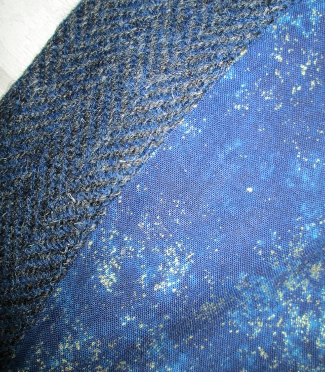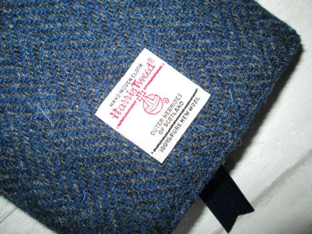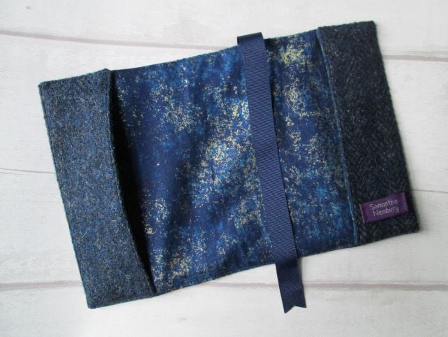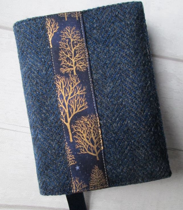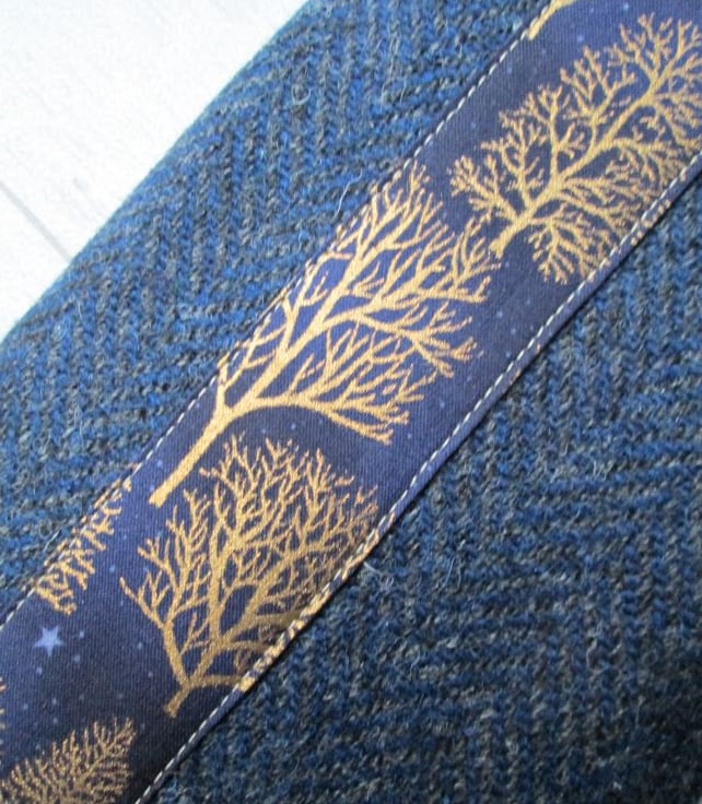 Another lovely piece of 'Harris Tweed' handwoven by 'A Harris Tweed Weaver' on the Isle of Lewis - this one is a subtle combination of navy and dark grey in a herringbone weave, which provided the perfect backdrop to a lovely print of metallic gold winter trees on midnight blue.