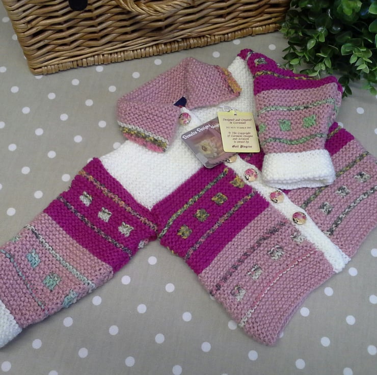 A lovely cosy warm baby girl's cardigan/jacket designed and hand crafted using quality branded premium British and French yarns. The buttons are made from genuine wood with a sweet flower design on them. The sleeves have a good wide turn up cuff which can be adjusted during growing spells. The item has the Demelza garment label attached to the back neck edge with the care instructions woven within it for lasting reference and as proof of it's origins if gifting.