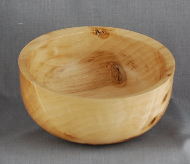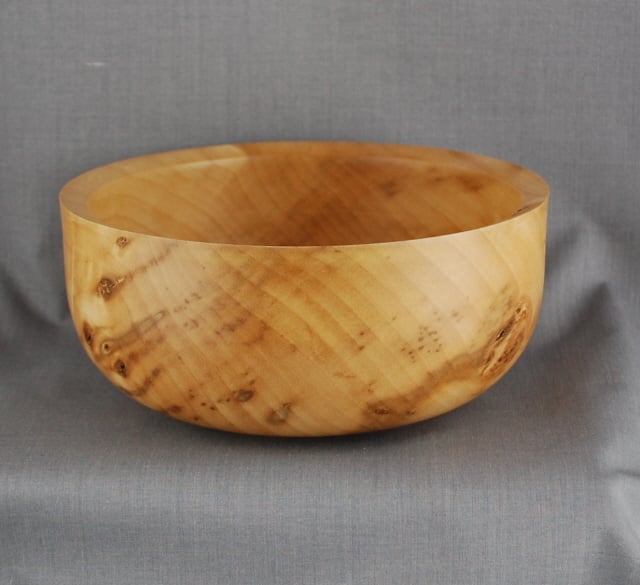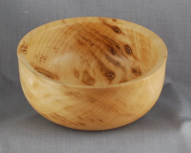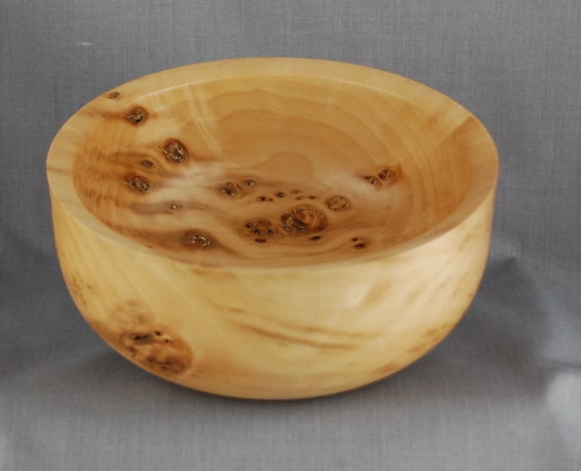 Simplicity itself, the beauty in this unique bowl comes from the variety of grain and colours contained within the history of the tree. Flowing grain is interrupted by clusters of dark spots-branch ends of various sizes. This beautiful bowl measures approximately 15.5 cm. in diameter and is 7 cm. high. We have finished it with great care, ensuring it is a beautiful object to own.
