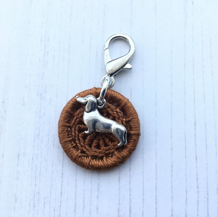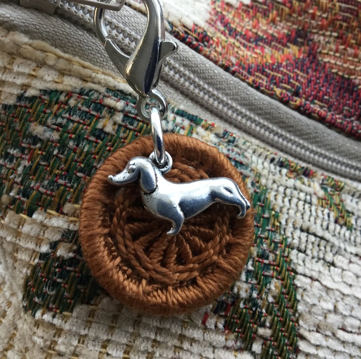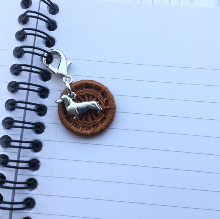 The button is hanging together with a cute Dachshund charm from a lobster claw catch. This type of catch enables you to move your charm easily between bags, spiral bound journals or notebooks.
