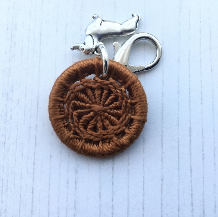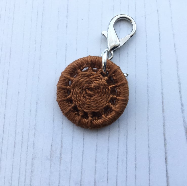 I have made this traditional Dorset Button using a chestnut brown pearl cotton thread on a 25mm brass ring, the finished button is slightly larger.
