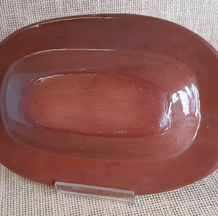 Oval dish made from terracotta earthenware, hand decorated with a medieval bee skep design.