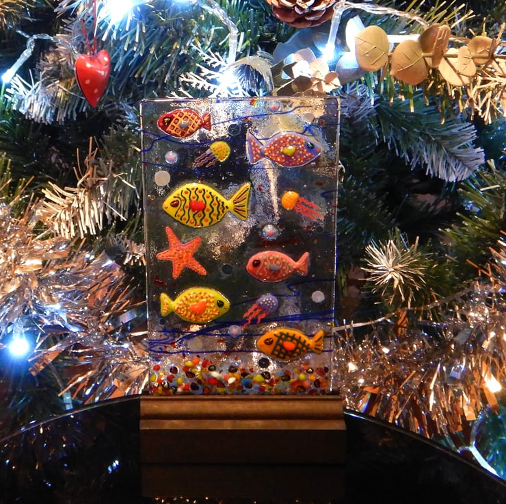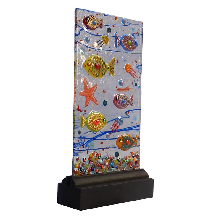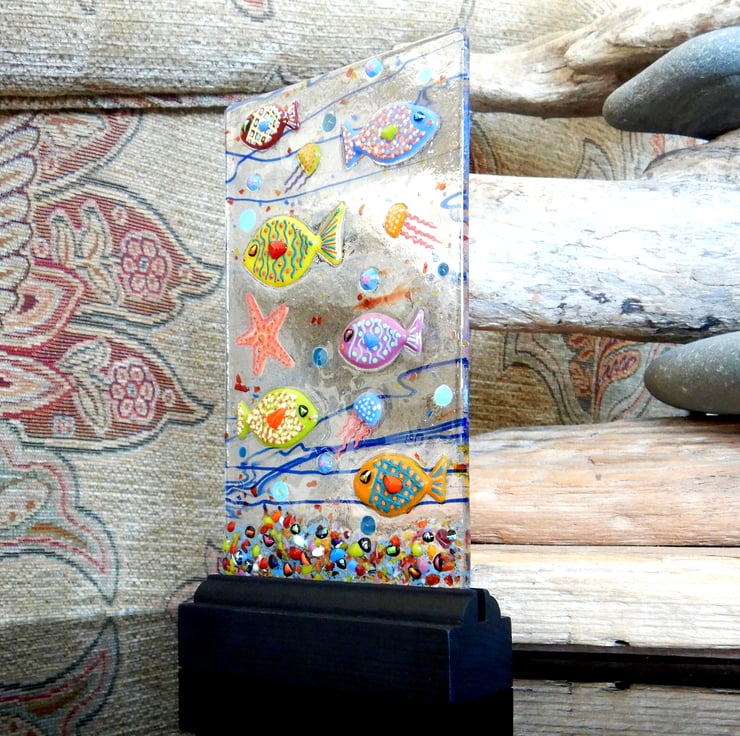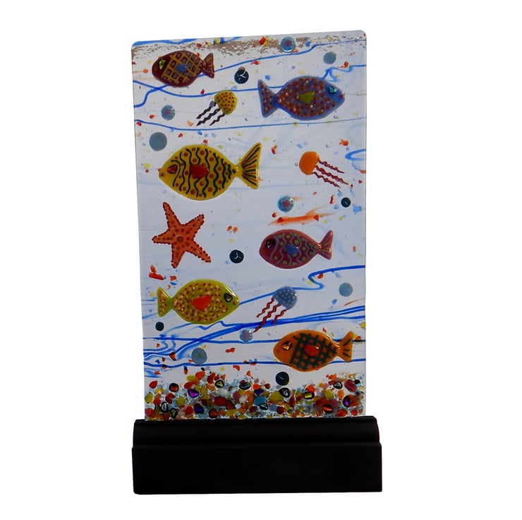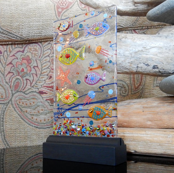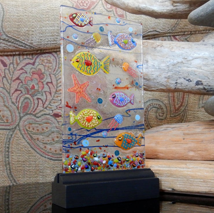 'FISHES' started off being a transparent sheet of bullseye glass. I then built upon it putting on the different coloured layers, glass frit, dichroic glass, glass paint, millefiori, and coloured glass sheet. Once the image is carefully tidied up, the glass picture is fused in a kiln. The firing of the picture takes up to 24 hours as the kiln must be cooled very gradually to avoid breaking the fusing glass.