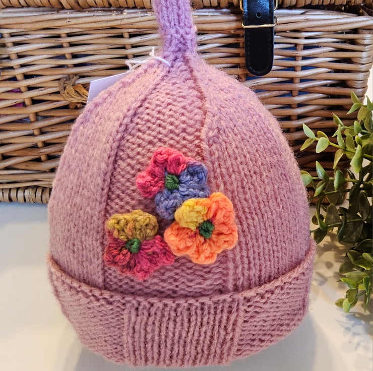 A lovely unique eye catching baby girl's wide ribbed stretch beanie hat designed and totally hand crafted in Cornwall. The yarn used is a quality mixed fibre branded 50% premium acrylic and 50% pure new wool yarn ( refer to photograph of ball band).