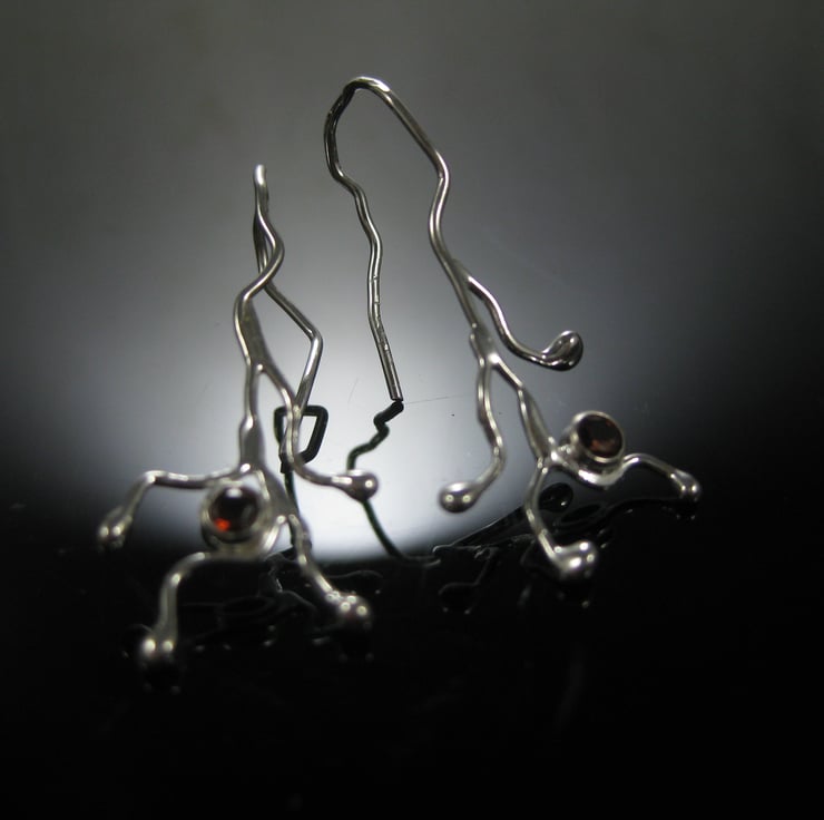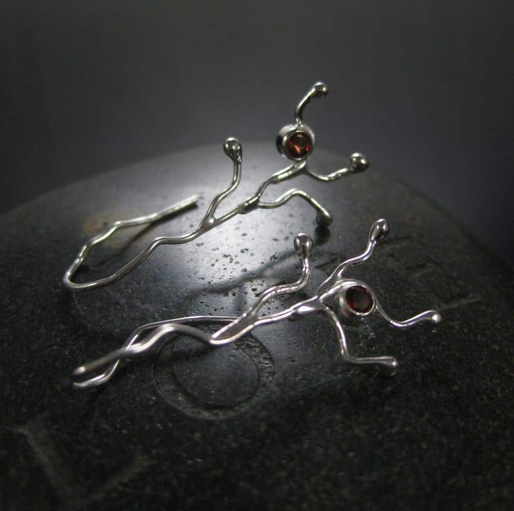 Argentium silver twiglet earrings with a small red garnet set into the twig. The earrings measure 16 mm at the widest part and they are 33mm long from the top of the earring wire. The stone is 2mm diameter.