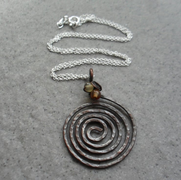 Copper spiral Pendant which has been made with copper wire has then been hammered to give texture and has been oxidised to give an aged look.the pendant has two pale coloured carnelian 4 mm semi precious gemstones attached at the top with copper wire