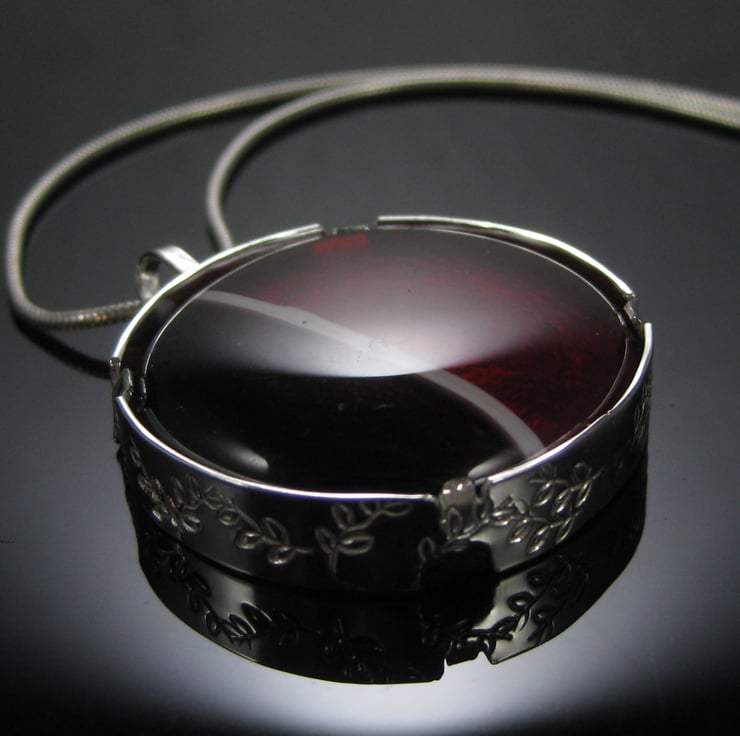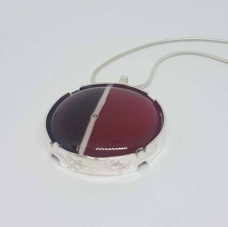 Circular purple, red and white fused glass pendant held in a stylish sterling sliver setting, stamped with a leaf motif around the sides. The pendant is 3.2cm in diameter.