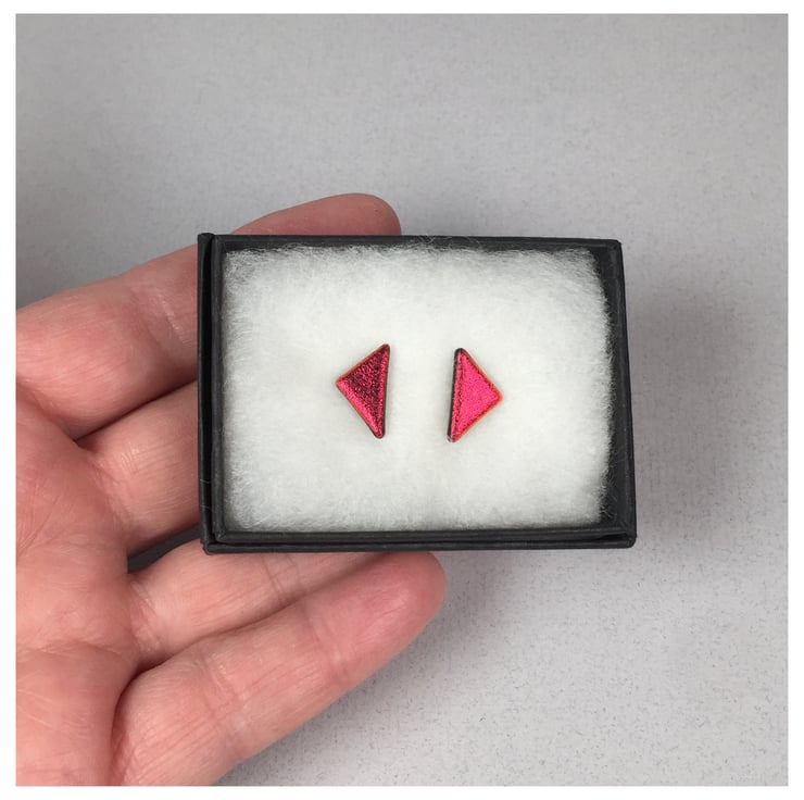 This listing is for a cute pair of small red triangle dichroic-glass stud earrings with sterling silver posts.