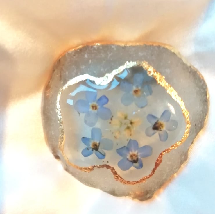 This old piece of bottle base, found on the Kent shore, has been smoothed by the waves. Forget-me-not early spring flowers are cased in resin. The edges are decorated with gold leaf and sealed with shellac. The brooch pin is securely attached with resin. Size 4cm by4cm.