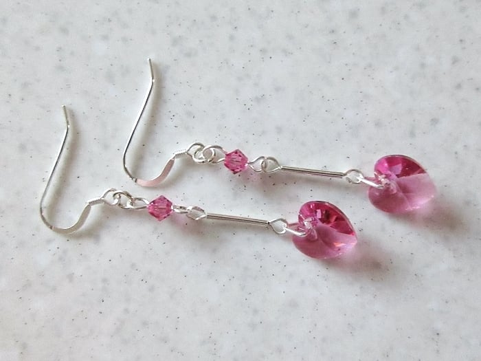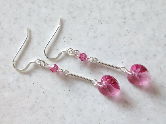 These very feminine sparkly crystal earrings have pink heart shaped Swarovski Crystals from the Swarovski Elements range.