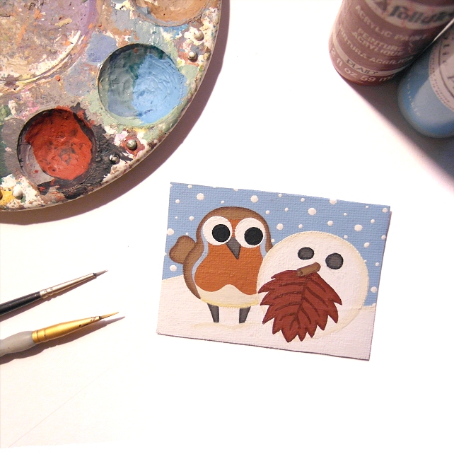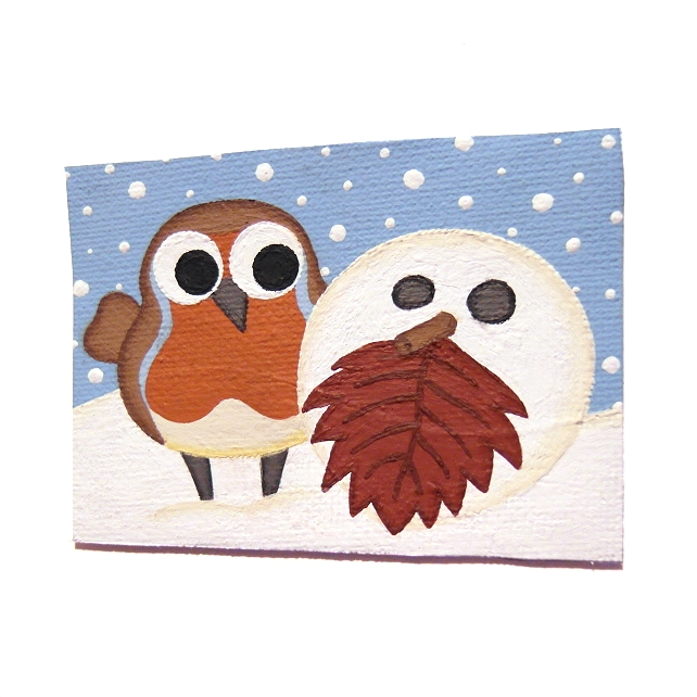 A small painting of a cute little robin looking surprised and intrigued as it finds a new friend in the snow - a snowball decorated with a red leaf, a twig and 2 small pebbles, to look like a robin.
