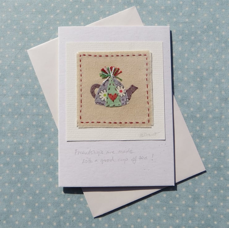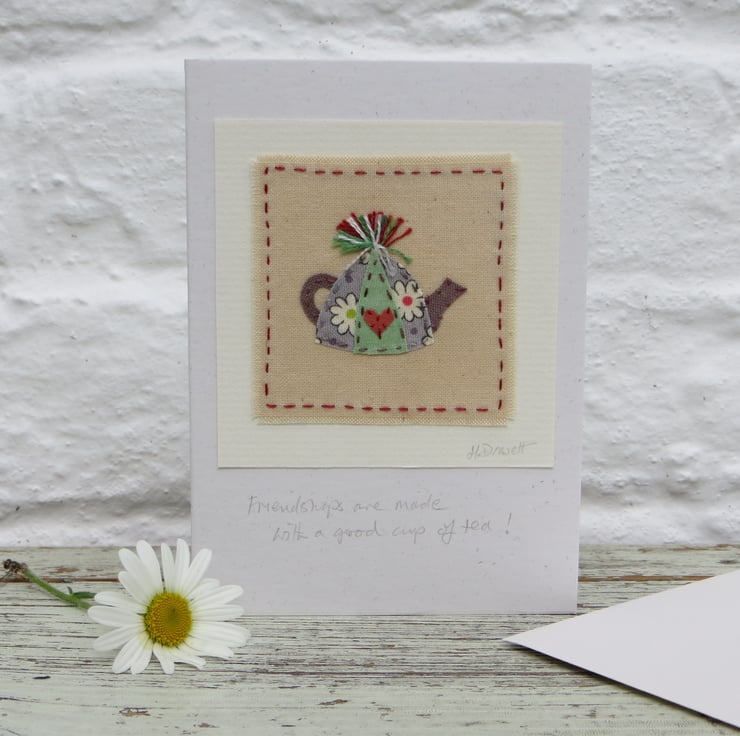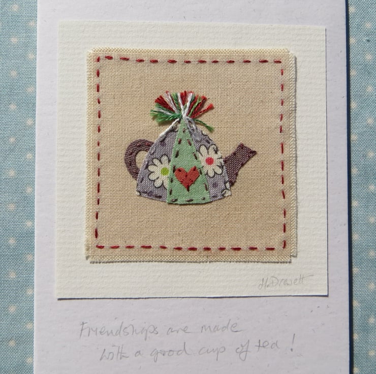A miniature hand-stitched applique teapot with heart motif and intricate top-stitched details. Beneath the textile I have written 'Friendships are made with a good cup of tea!' making this a lovely card to give to a friend you meet often and chat to over a cuppa! Suitable for birthday or perhaps a thank you for listening and being there.