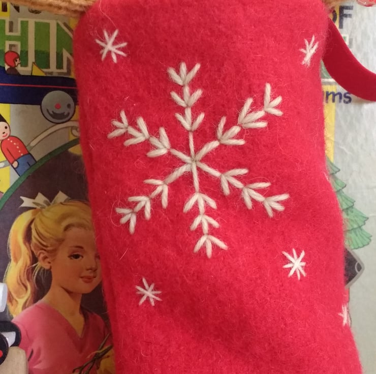 Hand embroidered using a selection of vintage tapestry wool and threads with an assortment of cream snowflakes and stars.